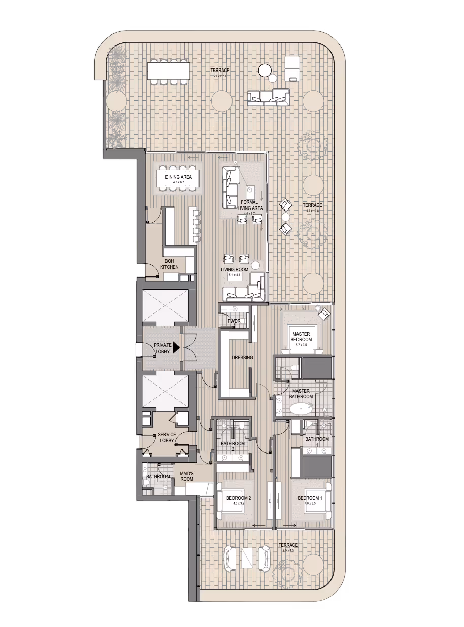 Tous les résidents auront accès à des services haut de gamme, avec notamment un concierge, un service de ménage, un majordome et un portier. Ceux qui souhaitent se détendre à la plage apprécieront le service exclusif de "yacht volant", qui transporte les résidents jusqu'à la marina du Beach Club.